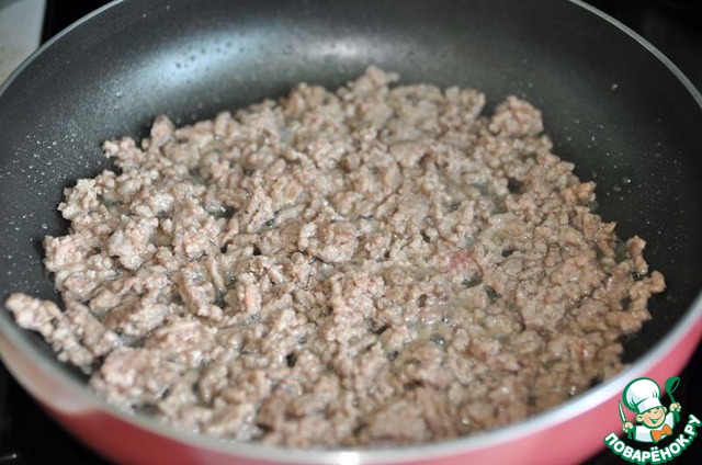 Обжариваем на растительном масле фарш до обесцвечивания.