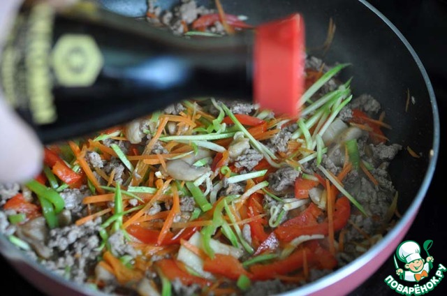 Наливаем 2 ст. ложки соуса в овощи с фаршем.