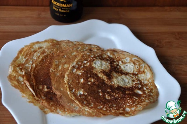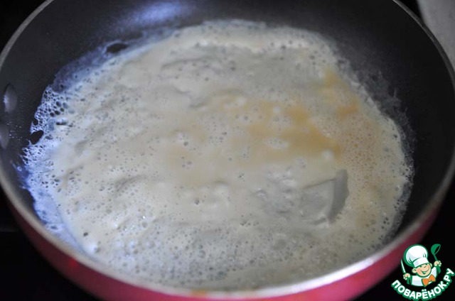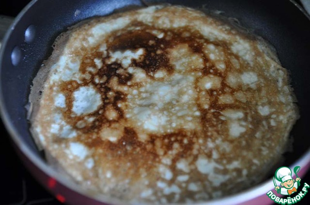 Выпекаем блинчики. Я брала сковороду диаметром 18 см. Смазываем сковороду растительным маслом, наливаем тесто. У вас должны получаться именно тонкие блинчики, а не омлет.
