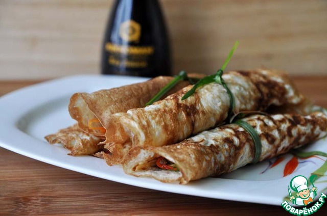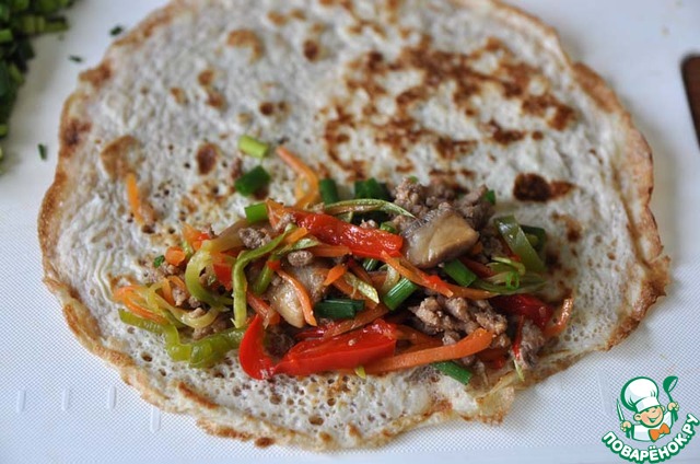 Берём блинчик, кладём на край начинку, посыпаем рубленным зелёным луком, сворачиваем в трубочку.