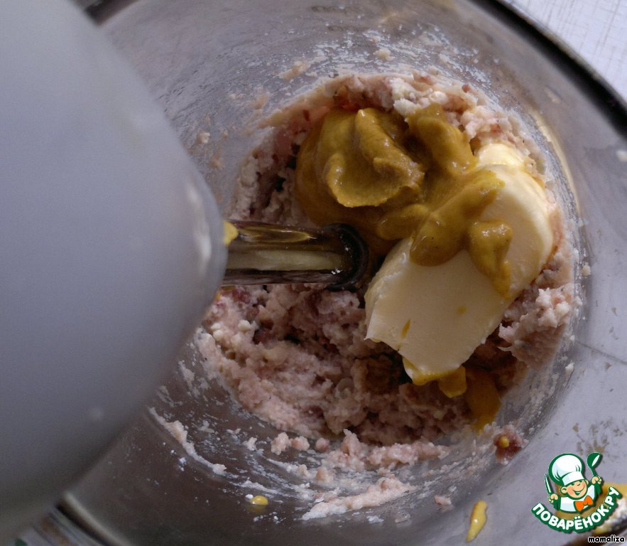 Добавить размягченное сливочное масло и горчицу и еще раз взбить.
