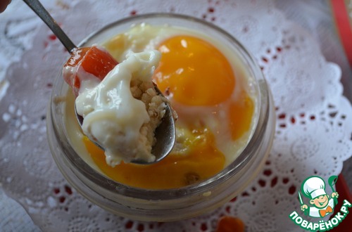 Формы ставим в большую форму для запекания и заполняем ее горячей водой. Чтобы вода доходила примерно до половины формочек с яйцами. Ставим в горячую духовку на 10-15 мин., чтобы желтки только начали схватываться.