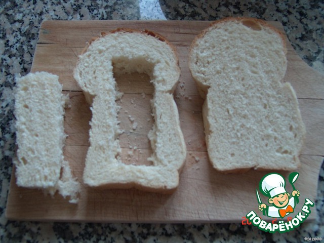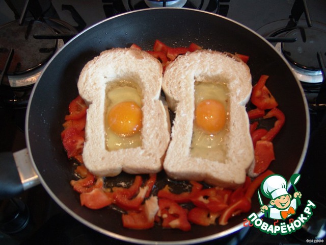 Кладем на сковородку хлеб с дырочкой посередине и вокруг нарезанный перец. В дырочку вбиваем яйцо. Солим мелкой солью.