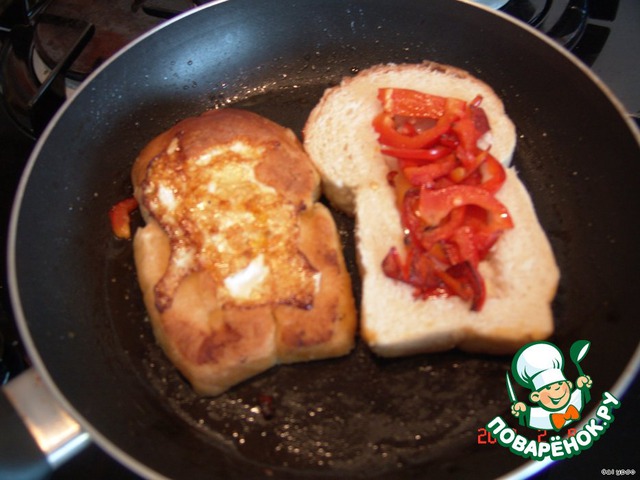 Жарим так до подрумянивания хлеба, затем собираем поджаренный перчик сверху на яичницу и переворачиваем.