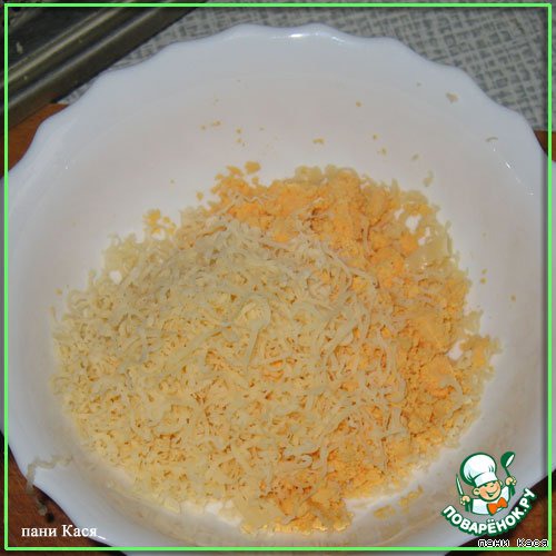 Желтки покрошить, потереть в них сыр, выдавить через пресс чеснок, заправить майонезом