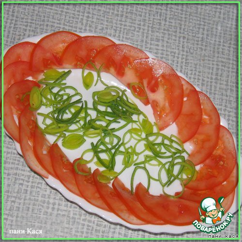 Тарелочку оформить лепестками помидора, полосками лука-порея.