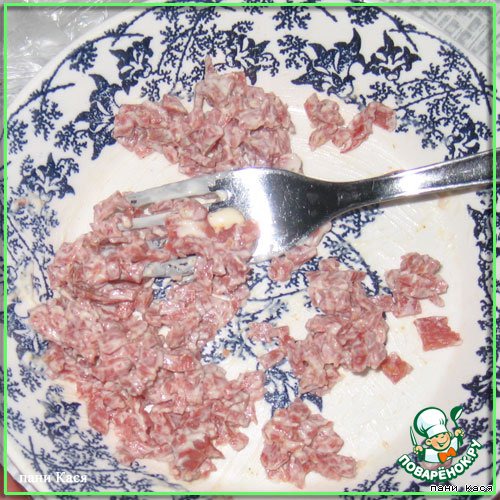 Колбаску нарезать как можно мельче, приправить чем любите (у меня - любимая индийская приправа острая), добавить чуть майонезика
