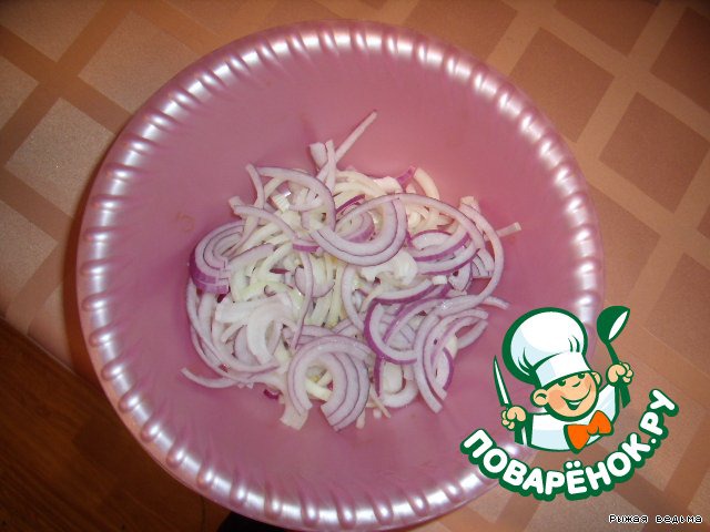 Маринованный лук выкладываем на тарелку, начиная от края.