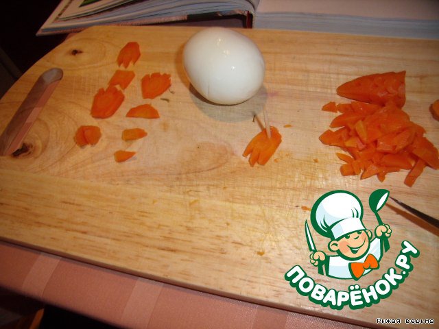 Из моркови вырезаем мелкие детали для украшения. Прикрепляем их к яйцу.