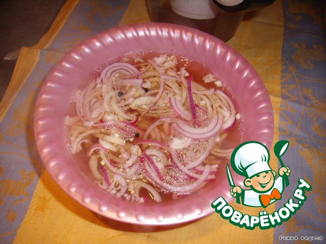 Заливаем лук горячим маринадом и оставляем на 30 минут.