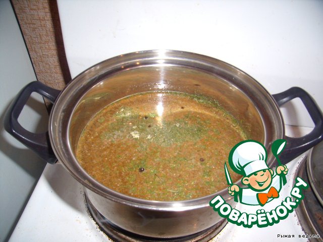 Готовим горячий маринад. Для этого нужно вскипятить воду с уксусом, солью, сахаром и пряностями.