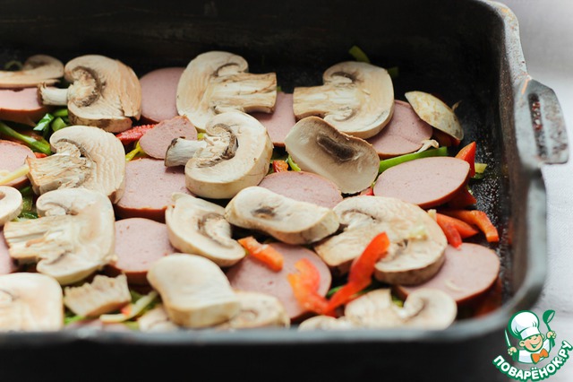 Дно немного посыпте манкой или сухарями для панировки, нарежте и выложите в форму продукты для пиццы