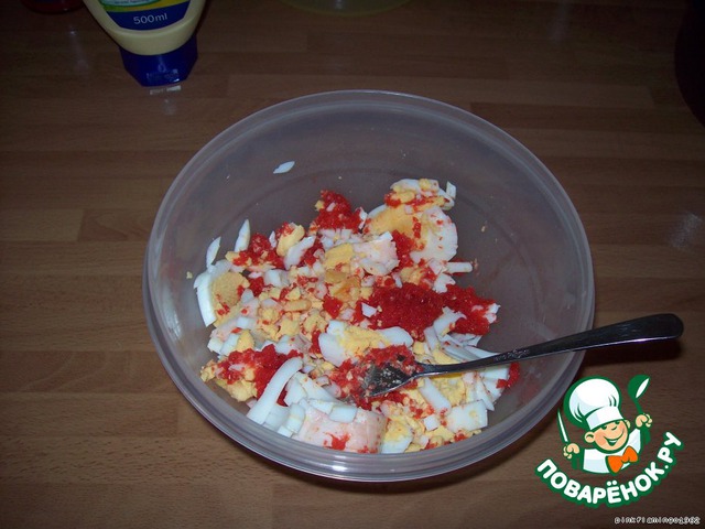 Добавить майонез и перемешать. Я много майонеза не добавляю.