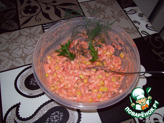 Я сегодня добавила в салат ещe 2 ложки кукурузы консервированной, получилось неплохо.