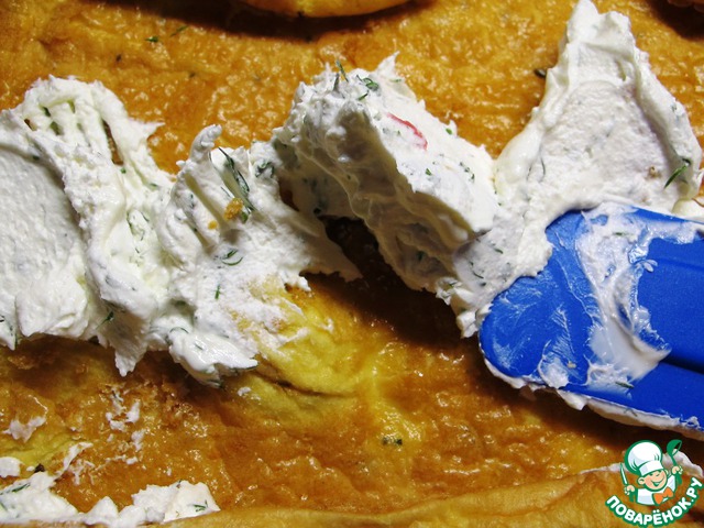 У остывшего омлета ровно обрезать края, намазать сливочным сыром, смешанным с зеленью.