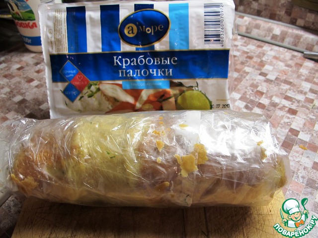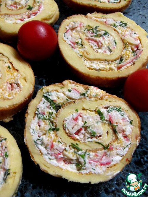 | Рулет на основе итальянского омлета фриттаты с начинкой из крабовых палочек. |
