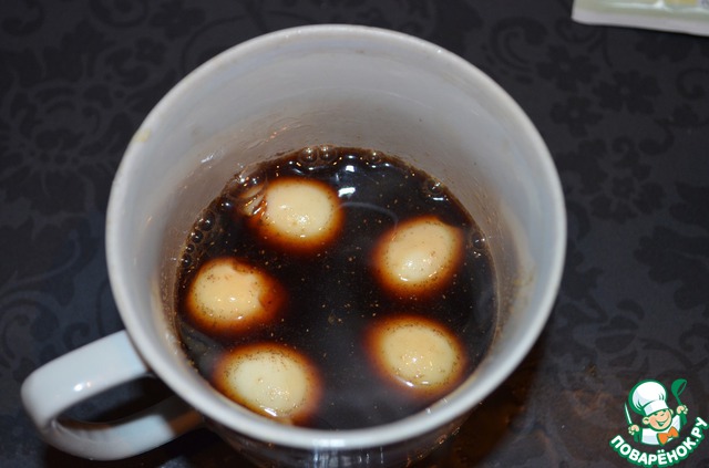 5. Маринад переливаем в кружку или в другую посуду и добавляем туда сваренные, почищенные яйца. Остужаем до комнатной температуры и убираем в холодильник минимум на 1 ночь (я попробовала на 5 день).