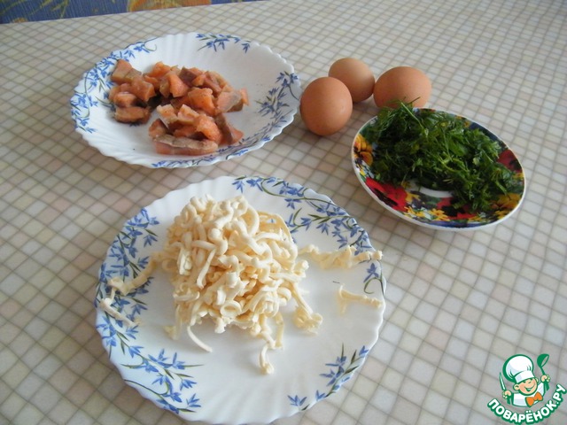 Рыбу режем небольшими кусочками, сыр трем на крупной терке, мелко режем зелень (для меня в этом блюде вкуснее укроп), яйца взбиваем венчиком.