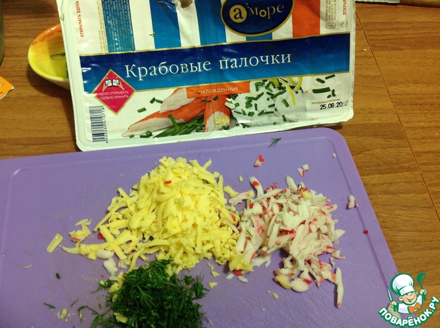 Тертый сыр, мелко рубленную зелень и крабовые палочки перемешиваем.