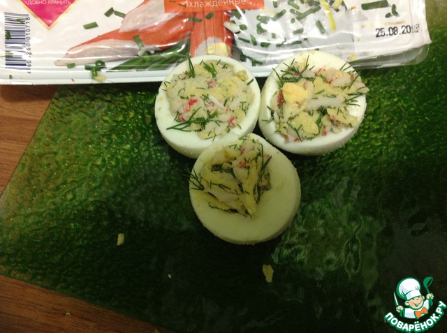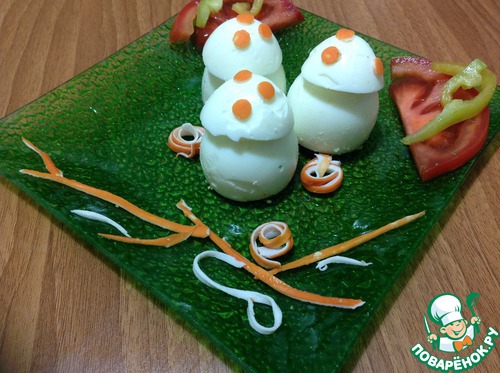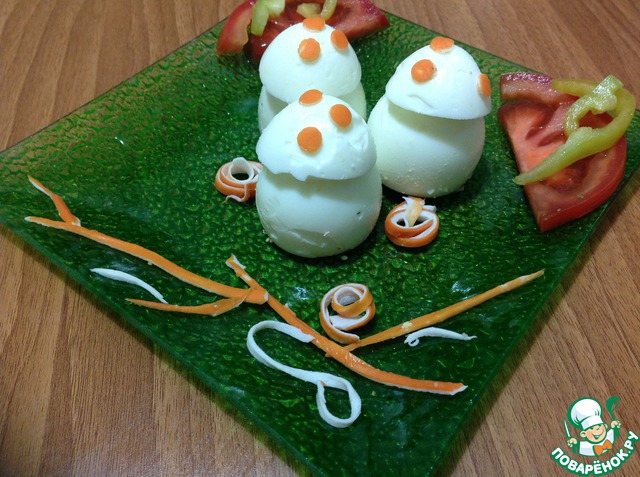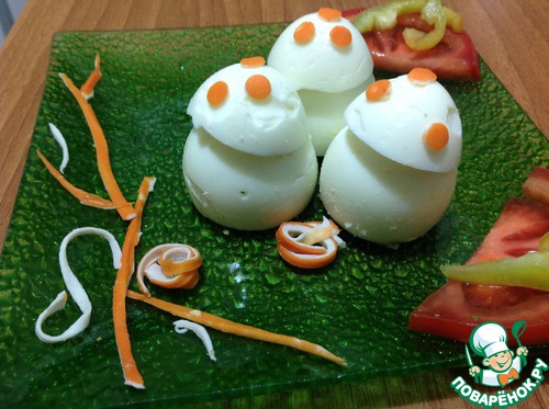 На блюдо переворачиваем яйца начинкой вниз, сверху одеваем "шапочку" и украшаем по желанию.