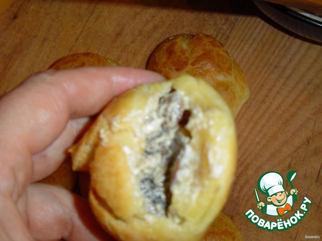 Когда эклеры готовы,мы занимаемся начинкой.Дя этого нарезаем шампиньоны и лук,обжариваем их на сливочном масле.Когда грибы почти готовы,мы их солим и перчим,и добавляем к ним сливки.Через 2-3 минуты добавляем плавленый сыр и даем ему расплавиться.Хорошо все перемешиваем и добавляем взбитые яйца.Когда добавили яйца,то перемешиваем постоянно.Вот и готова начинка.