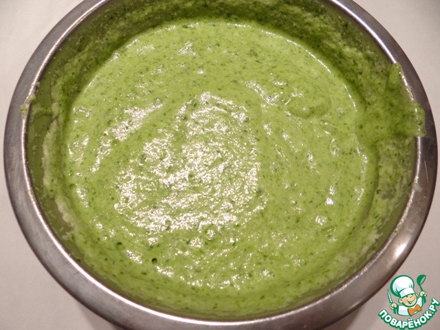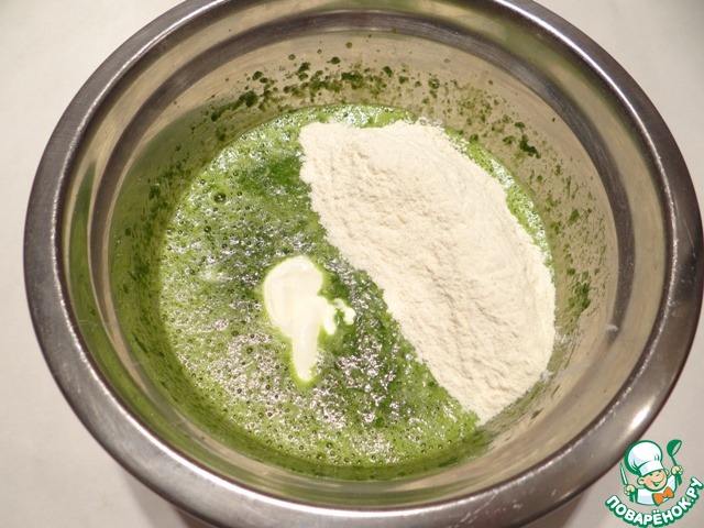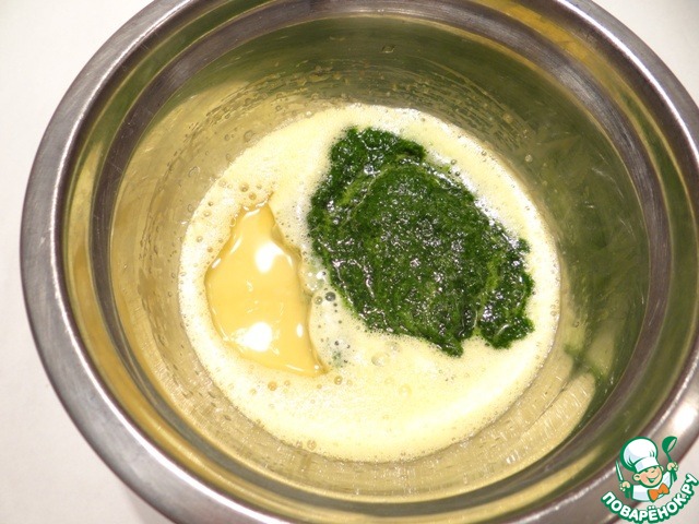 К взбитым желткам добавляю растительное масло, соль, измельченный шпинат, взбиваю массу.