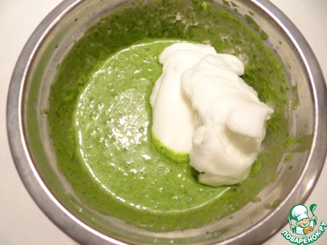 К шпинатной массе добавляю сначала 3-4 столовые ложки взбитых белков, аккуратно перемешиваю ложкой.