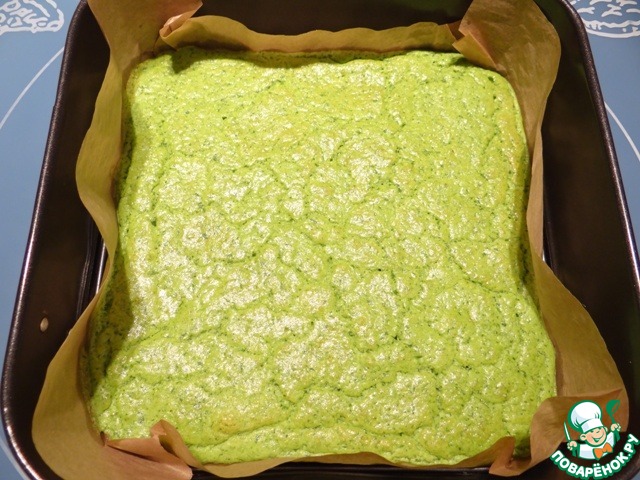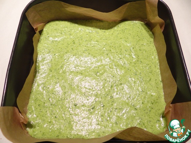 У меня маленькая духовка, поэтому для выпечки шпинатного теста я использую разъемную квадратную форму размером 23*23 см и выпекаю два коржа (если у Вас духовка большая, то можно использовать противень размером 28*40 см). Застилаю форму бумагой для выпечки, выливаю половину теста.
