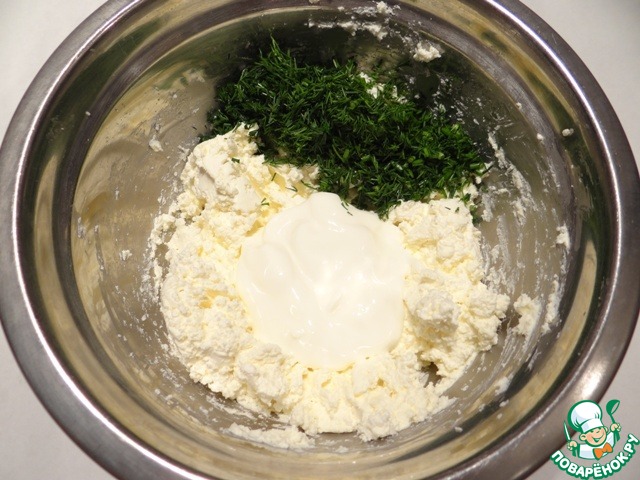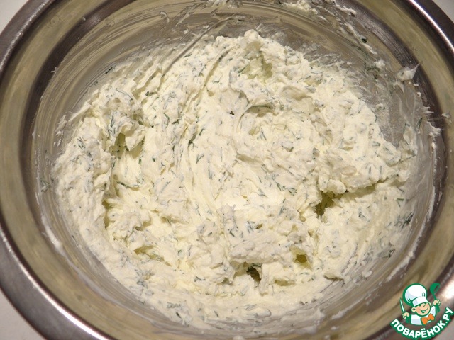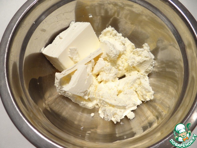 Пока коржи остывают, готовлю прослойку. В миске соединяю сливочный сыр и фету, с помощью вилки хорошо перемешиваю массу.
