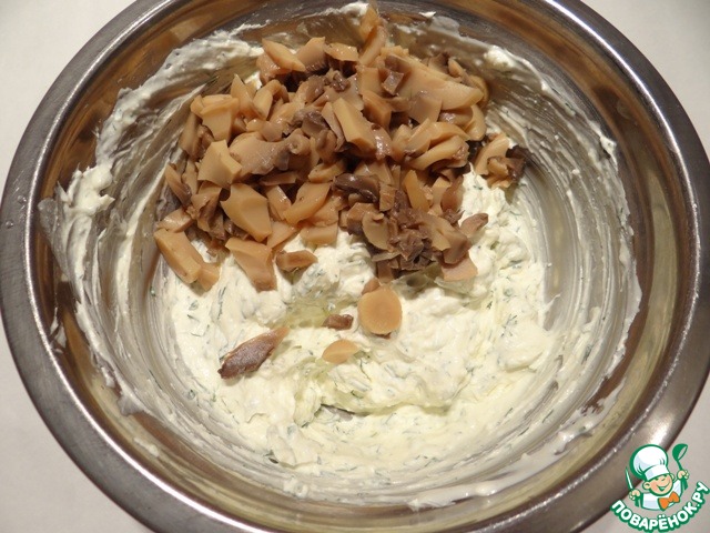 Затем добавляю растворенный желатин к оставшейся сырной массе, хорошо перемешиваю, добавляю шампиньоны.