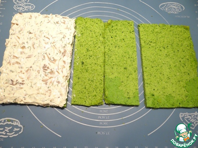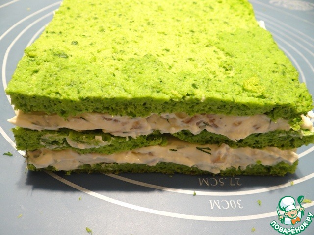 | Эта замечательная праздничная закуска очень понравилась всей моей семье. Нежный шпинатный бисквит прекрасно сочетается с прослойкой из сливочного сыра, феты и консервированных грибов! За рецепт огромная благодарность Sara & Miki. |