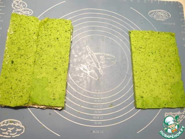 Два коржа я разрезаю так. чтобы получилось три одинаковых (один слой из бисквита будет состоять из 2-х частей, если Вы выпекаете один корж - просто разделите его на три равные части).