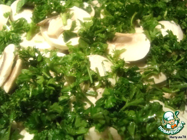Заправить грибы и петрушку. Тщательно перемешать. Дать настояться 15 минут.