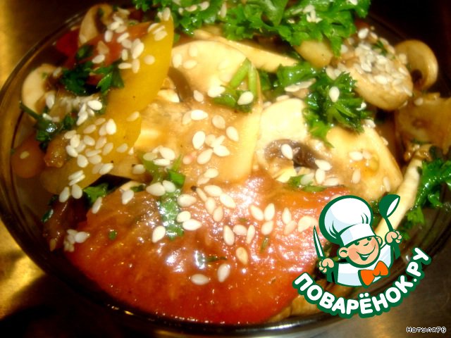 | Очень вкусная и легкая закуска из свежих шампиньонов с помидорами. |
