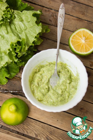 Половинку авокадо режем на небольшие кусочки, поливаем соком лимона (у меня лайм), измельчаем при помощи вилки.