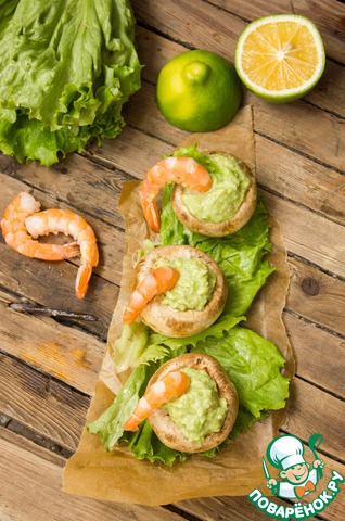4 штуки порезать мелко и уложить на дно шампиньонов, поверх выложить мусс из авокадо.