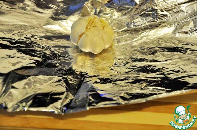 Тем временем берём чеснок, заворачиваем в фольгу и запекаем в духовке при 180 градусах 20 минут. Я это делала на решётке, положив почти на низ духовки и включив нижний нагрев.