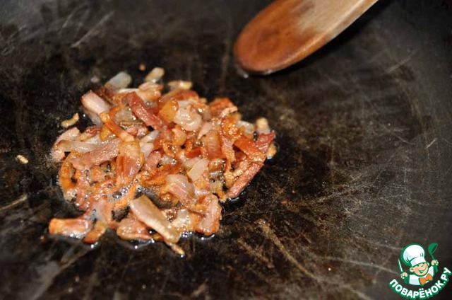 Тонкими полосками нарезаем сырокопчёный бекон и обжариваем на сковороде.