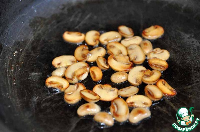 Тонкими пластинами нарезаем шампиньоны (у меня отваренные) и обжариваем их на вытопленном жире от бекона.