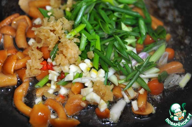 Добавляем к грибам зелёный лук, чеснок, имбирь и жгучий красный перец.