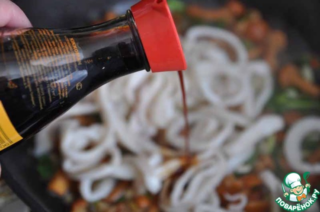 Добавляем к обжаренным грибам кальмары и поливаем соевым соусом.