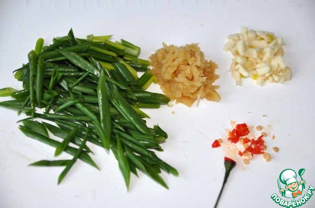 Зелёный лук нарезаем тонкими перьями, корень имбиря натираем на мелкой тёрке, чеснок и красный жгучий перец мелко нарезаем.