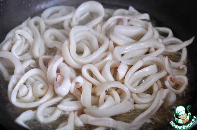 На смеси растительного и кунжутного масла обжариваем кальмар, достаточно 2 минут.