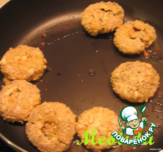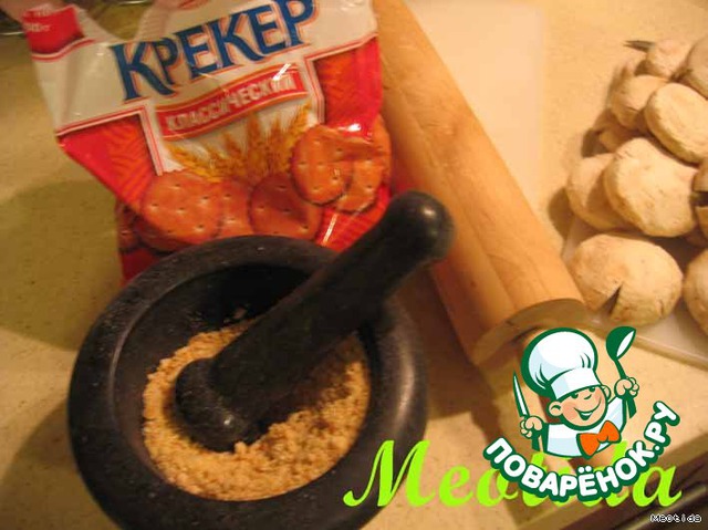 теперь обмакиваем хорошенько шляпки грибов в яйцо, а затем в измельченный крекер, повторяем это два раза (чтобы корочка из крекера была потолще)