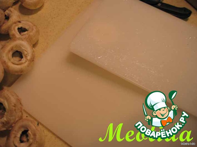 кладем шляпку между двух разделочных досточек и раздавливаем, превращая в толстенький блинчик