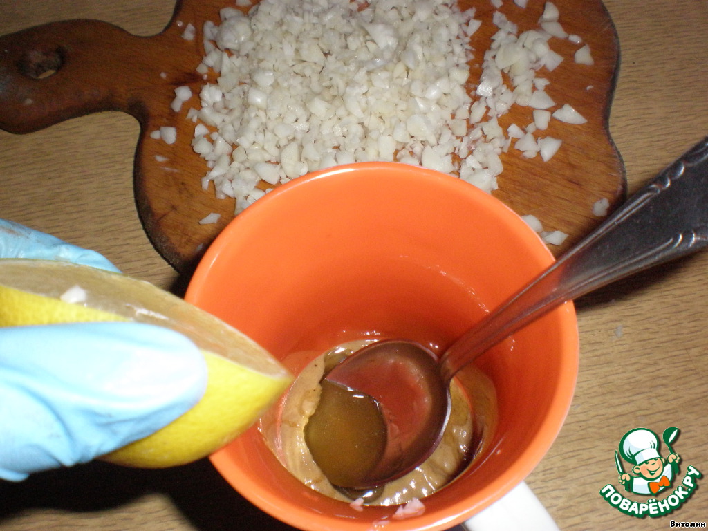 Заправка - смешать горчицу, мёд, сок лимона, чеснок, зелень, соль.