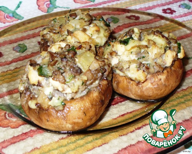 Начинить шляпки шампиньонов полученной начинкой. Выложить всё на противень. Готовить в духовке 210 град, 15 мин.