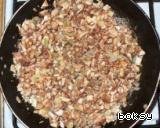 Нарезать мелко лук и ножки от шампиньонов, а затем обжарить их.