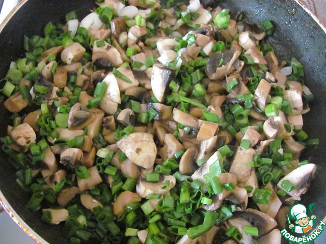 Для тех, кто будет специально готовить такое блюдо, сначала нужно поставить варить картофель на пюре. А т. к. у нас оно уже готовое, мы сначала приготовим начинку. Грибы нарежем некрупными кусочками и обжарим с луком, порезанным средним кубиком, на растительном масле до готовности.