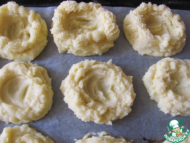 На пергаментную бумагу кондитерским шприцом выдавливаем гнёздышки из картофельного пюре.